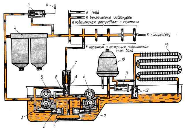 Клапаны смазочной системы: 1 – маслоприемник; 2, 9 - предохранительные клапаны нагнетающей и радиаторной секций; 3, 8 - нагнетающая и радиаторная секции масляного насоса; 4 - полнопоточный масляный фильтр; 5 - перепускной клапан с сигнализатором засорения; 6 - лампа сигнализатора засорения полнопоточного масляного фильтра; 7 - дифференциальный клапан смазочной системы; 10 - центробежный масляный фильтр; 11 - перепускной клапан центрифуги; 12 - сливной клапан центрифуги; 13 - масляный радиатор