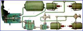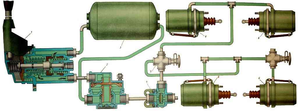 Стояночный тормоз: 1 – тормозной кран обратного действия с ручным управлением; 2 – ускорительный клапан; 3 – баллон сжатого воздуха; 4 – двухмагистральный клапан; 5 – клапан контрольного вывода; 6 – тормозные камеры с пружинным энергоаккумулятором