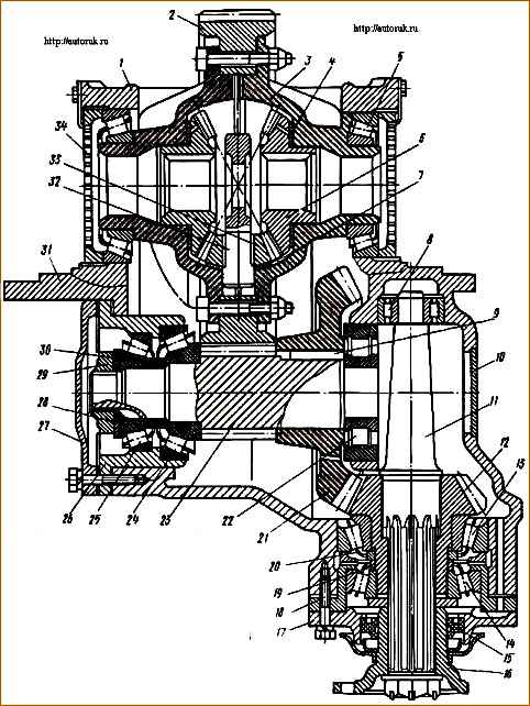 Конические подшипники корпуса дифференциала регулируют с помощью регулировочных гаек 34 (рис.1), которые затягивают до увеличения расстояния между поверхностями крышек подшипников на 0,1-0,15 мм.