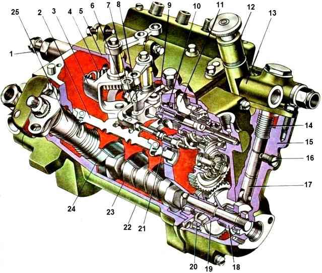 Топливный насос установлен между рядами цилиндров и приводится в действие от шестерни распределительного вала через автоматическую муфту опережения впрыскивания топлива.