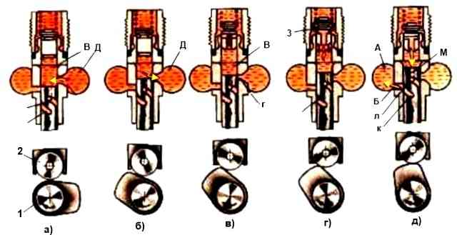 При движении плунжера вверх под действием набегающего кулачка 1 (рис. б) в начале происходит вытеснение части топлива обратно в канал "Д", но как только торцовая кромка плунжера перекроет впускное отверстие "Г" (рис. в), обратный перепуск топлива прекращается и резко возрастает давление оставшегося топлива, запертого в надплунжерной полости.