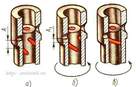 Если еще раз повернуть плунжер в ту же сторону (рис . 4в), паз расположится после отсечного отверстия и надплунжерная полость на всем протяжении хода плунжера окажется сообщенной с этим отверстием.