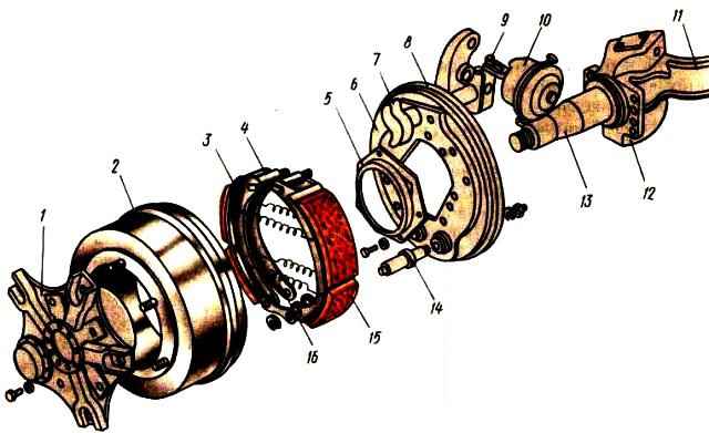 Тормозные механизмы передних колес отличаются от тормозных механизмов задних конструкциями суппорта, корпуса разжимного кулака и самого разжимного кулака.