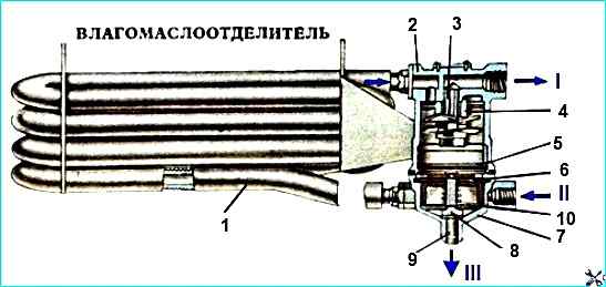 Клапан 8 слива конденсата открывается, скопившаяся смесь воды, и масла через вывод III удаляется в атмосферу.