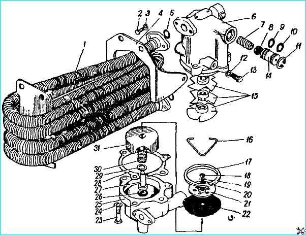 Вынимаем из крышки поршень 31 в сборе и разбираем его: снимаем стопорное кольцо 18, шайбу 19, диск 21, мембрану 22, пружину 30, уплотнительное кольцо 29, золотник 27.