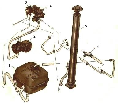 Гидравлический механизм подъема (рис.) состоит из коробки 2 отбора мощности с масляным насосом, гидроцилиндра 5 крана 4 управления, клапана 6 ограничения подъема платформы, электро-пневмоклапанов 3, масляного бака 1 с фильтром и системы пневмо- и гидропроводов.