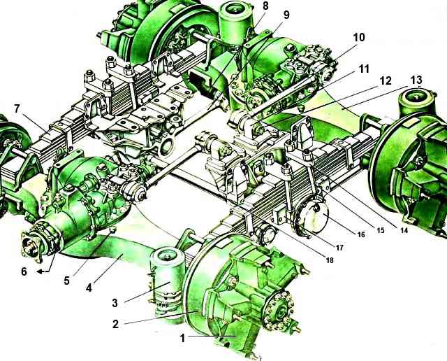 При такой подвеске промежуточный и задний мосты качаются относительно оси балансира