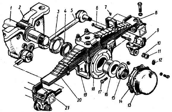 Балансирная подвеска промежуточного и заднего мостов автомобиля КамАЗ-5320 показана на рис.1