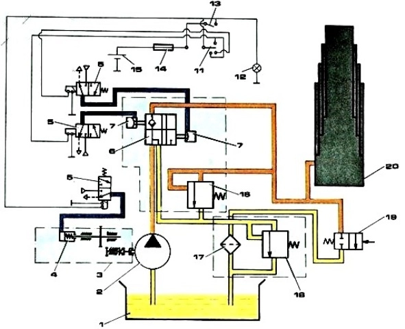 Следует отметить, что опускание платформы возможно как при работающем насосе, так и в том случае, когда масляный насос уже отключен выключателем 13.