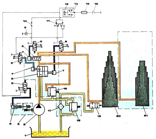 Масло из крана управления поступает по трубопроводам в гидроцилиндр 17.