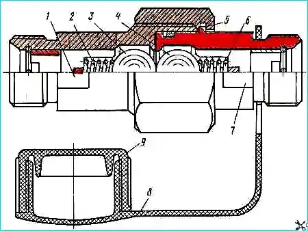 Запорное устройство, предназначенное для соединения гидросистемы автосамосвала-тягача КамАЗ-55102 с гидросистемой прицепа, состоит из двух корпусов 1 и 7, один из которых соединен с нагнетательной магистралью тягача, другой — прицепа.