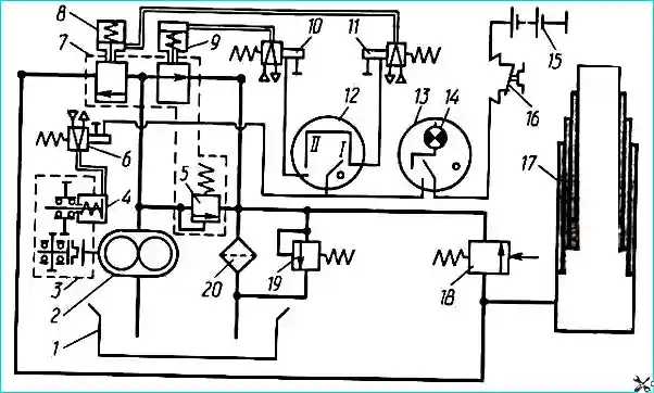 При включении сцепления масляный насос 2 начинает работать.