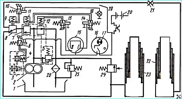 Ток поступает к обмотке электромагнита, сердечник которого, перемещаясь, открывает электропневмоклапан 10, воздух из пневмосистемы поступает в пневмокамеру 9 гидрораспределителя, магистраль гидроцилиндра тягача перекрывается, но открывается проход маслу в гидроцилиндр 22 прицепа.