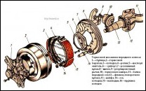 Синхронизатор четвертой и пятой передач (рис.1 ) состоит из каретки 2 синхронизатора, двух фрикционных колец 1 и 4, восьми блокирующих пальцев 3 и восьми фиксаторов, состоящих из пружин 6 и сухарей 5 фиксаторов.