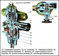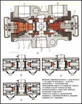 Двойной защитный клапан (рис.1) предназначен для разделения питающей магистрали на два автономных контура (вспомогательного и стояночного тормоза) и автоматического отключения поврежденного контура с целью сохранения необходимого давления в исправном контуре.
