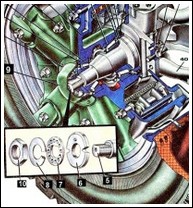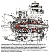 Вторичный вал 8 имеет две опоры: роликовый подшипник, установленный в гнезде первичного вала, и шариковый подшипник, расположенный в гнезде заднего торца картера и закрепленный от осевых перемещений стопорным кольцом, установленным в канавке его наружного кольца