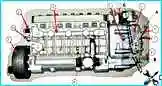 Для снятия генератора отключите массу аккумуляторных батарей, поднимите кабину автомобиля КамАЗ и отсоедините выводы "+", "—", В