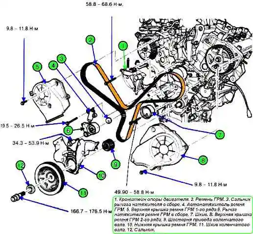 2-ші бүйірлік жұдырықша білігінің тісті (C) ► Су сорғысының шкиві (D) ► 1-ші реттік шығару таратқыш білігінің жұлдызшасы (E) ► Кергіш шкив (F).