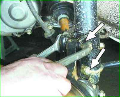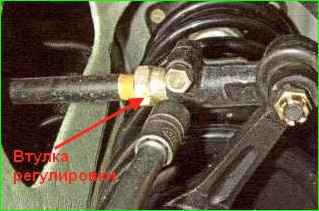 Бұрыш жоғарғы және төменгі болттардың гайкаларын босатып, амортизатордың тіреуішін руль түйініне бекітетін жоғарғы болтты бұру арқылы реттеледі.