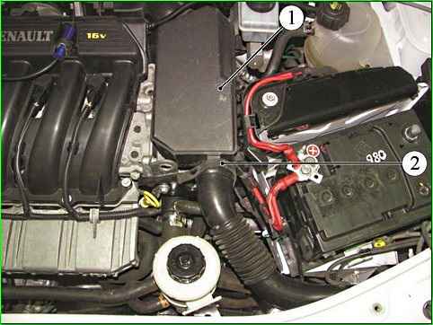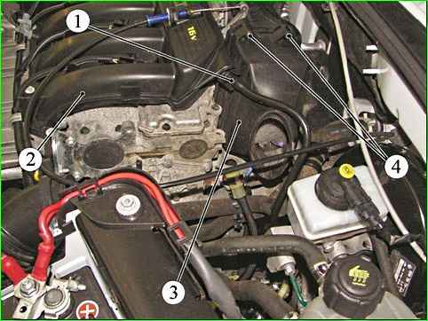 K4M қозғалтқышының ауа сүзгі корпусының қақпағын алу: 1 - вакуумдық тежегіш күшейткіш үшін вакуум таңдау шлангі; 2 - қабылдау коллекторы; 3 - ауа сүзгісінің корпусының қақпағы; 4 - ауа сүзгісі корпусының қақпағын бекітетін бұранда