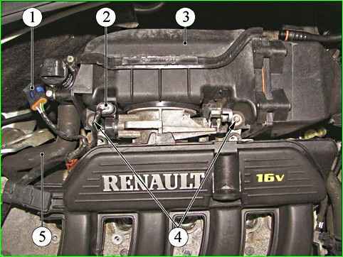 K4M қозғалтқышының ауа сүзгісінің корпусын алу: 1 - бос ауаны басқару құралының қадамдық қозғалтқышына сым сымдарының блогы; 2 - дроссель позициясының сенсорына сымдар блогы; 3 - ауа сүзгісінің корпусы; 4 - ауа сүзгісінің корпусын бекіту болттары; 5 - бензин буларын қалпына келтіру жүйесіне арналған құбыр