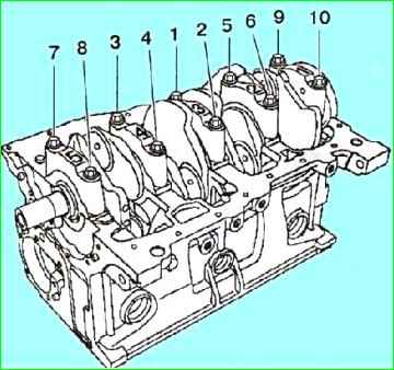 Осыдан кейін иінді біліктің негізгі мойынтіректерінің қақпақтарын бекітетін болттарды 3-суретте көрсетілген ретпен қатайтыңыз.