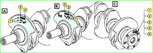 - 3 - маховик жағынан No5 негізгі журналдың диаметрі бойынша өлшем топтары;