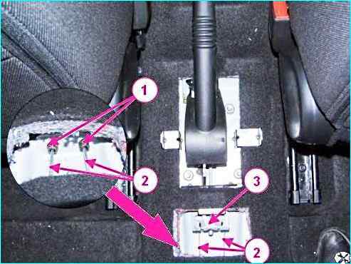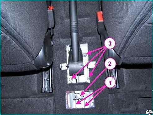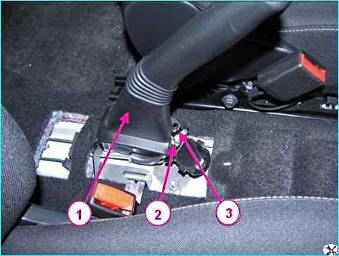 Қол тежегішінің тұтқасын алу: 1 – қол тежегішінің бұралуы; 2 - кабельдік эквалайзер; 3 - қол тежегішінің тұтқасын бекітуге арналған гайкалар