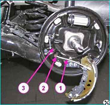 Бұрауыш пен қысқышты пайдаланып, кабельдерді тежегіш тақта жетектерінің тұтқаларынан ажыратып, ұштарын алыңыз 1, 5-сурет, кабельдер 2 тежегіш қалқандардағы тесіктерден.