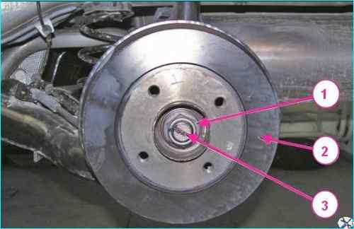 Артқы тежегіш барабанын алу: 1 - тежегіш барабанды бекіту гайкасы; 2 - тежегіш барабан; 3 - артқы доңғалақ торының осі