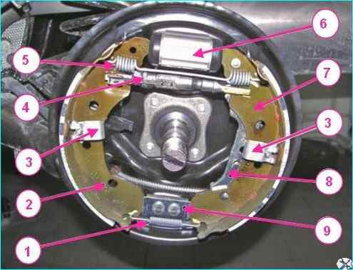Тежегіш төсемдерін ауыстыру: 1 - төменгі керме серіппесі; 2 - төсемдер; 4 - механизмі бар аралық жолақ; 7 - тежегіш төсемдер; 3 - саңылауларды автоматты реттеу бағыттағышын бекітуге арналған кронштейн; 5 - жоғарғы кернеу серіппесі; 6 – тежегіш цилиндр; 8 - қолмен тежеу тақтайшасының жетек тетігі; 9 - екпін