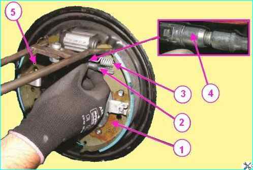 Артқы тежегіш бөліктері: 1, 5 - артқы тежегіш төсемдер; 2 - аралықты автоматты реттеу механизмі бар аралық жолақ; 3 - жоғарғы кернеу серіппесі; 4 – аралық жолақтың реттеу гайкасы