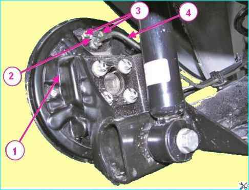 Артқы тежегіш дөңгелегі цилиндрін алу: 1 - артқы тежегіш қалқаны; 2 - артқы тежегіш дөңгелегі цилиндрі; 3 - доңғалақ цилиндрлерін бекіту болттары; 4 - тежеу құбыры