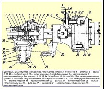 Алдыңғы осьтің орталық беріліс қорабының конструкциясы күріш. 1, доңғалақ берілістері мен айналмалы құрылғы суреттегі. 2, 3, суреттегі бірдей бұрыштық жылдамдықтардың топсасы. 4