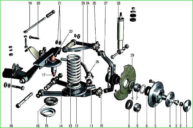 Жоғарғы 24 және төменгі 14 (1-сурет) ілмектер алдыңғы дөңгелектердің әрқайсысының тік жазықтықта тәуелсіз қозғалысын қамтамасыз етеді (жол кедергілерін жеңу кезінде).