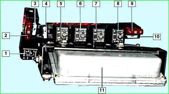 Блоктағы реле мен сақтандырғыштардың орналасуы: 1 - қосымша реле (төмен айналу жылдамдығында қосымша резистор арқылы оң жақ электр желдеткішін қосады); 2 - қосымша реленің қуат тізбектерін және оң жақ электр желдеткішінің релесін қорғайтын сақтандырғыш (50 А); 3 - электр отын сорғысы релесінің қуат тізбектерін қорғайтын сақтандырғыш (15 А); 4 - контроллердің тұрақты қоректену тізбегін қорғайтын сақтандырғыш (15 А); 5 - оң жақ электр желдеткіш релесі; 6 - сол жақ электр желдеткіш релесі; 7 - электр отын сорғысының релесі; 8 - негізгі реле; 9 - сол жақ электр желдеткішінің тізбектерін қорғайтын сақтандырғыш (50 А); 10 - сақтандырғыш (15 А), негізгі реле арқылы қосылған қуат тізбектерін қорғайтын; 11 - контроллер