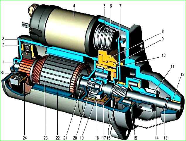 5722.3708 стартер түрі (1-сурет) планетарлық беріліс қорабымен және электромагниттік екі орамды тартқыш релесімен біріктірілген тұрақты магниттерден қозуы бар тұрақты ток электр қозғалтқышы