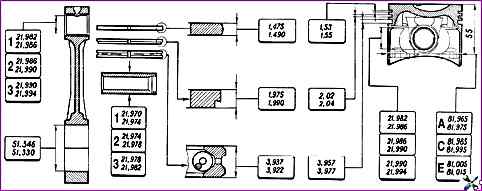 Осы втулкадағы тесік диаметрі бойынша шатундар 0,004 мм (поршеньдер сияқты) арқылы үш сыныпқа бөлінеді. 5-сынып нөмірі шатунның жоғарғы басына мөр басылған.