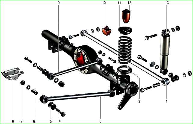 Артқы ось арқалығы реакциялық шыбықтар арқылы корпусқа бұрылмалы түрде қосылады - екі төменгі 3 және екі жоғарғы 9 бойлық және бір көлденең өзек 1.