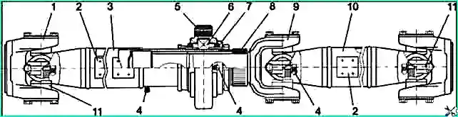 Кардан жетекі: 1 - жетек білігінің фланеці; 2 - теңестіру тақтасы; 3 - аралық кардан білігі; 4 - майлаушы; 5 - біліктің аралық тірек жастығы; 6 - подшипник; 7 - тығыздағыш сақина; 8 - сплайн шанышқы тығыздағыш; 9 - шпильді кардан шанышқысы; 10 - кардан білігі; 11 - кардан білігінің қиылысы