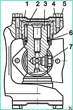 Кардан крест: 1 - мойынтірек қақпағы; 2 - подшипник; 3 - кардан кресті; 4 - құлыптау тақтасы; 5 - болт; 6 - тығыздағыш сақина; 7 - аша немесе май құюшы