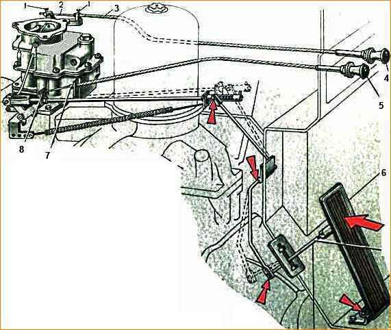 Аяқ жетегі карбюратор штангасындағы бұрандалы шанышқымен және дроссельді басқару педальының бұрандалы штангасы арқылы реттеледі, осылайша дроссельдер толығымен ашылғанда, педаль еденге 3-5 мм жетпейді.