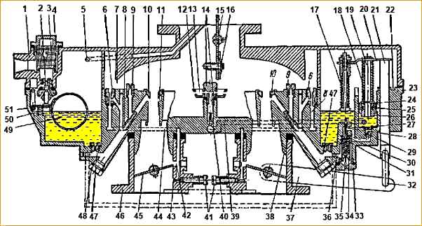 Вакуумның әсерінен карбюратордың қалқымалы камерасынан негізгі ағын 47 өтетін отын бос тұрған ағынға 6 бағытталады прогресс.