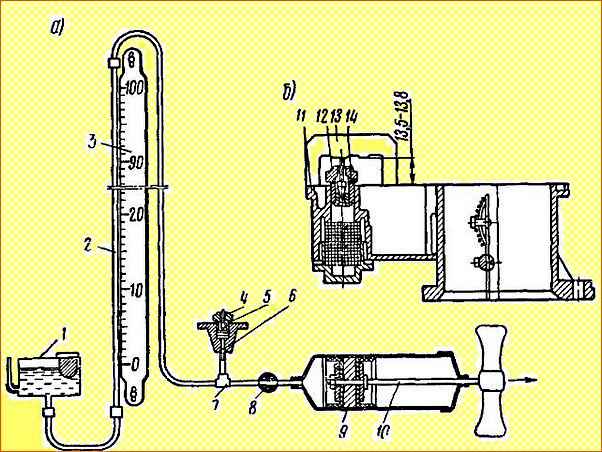 Жиналған отын беретін ине клапанының тығыздығы вакуумдық қондырғының көмегімен тексеріледі (Cурет 5, а). Тығыздағышпен 5 инелі клапан жинағы 4 түтігі тройникке 7 бұрандаланған корпуста 6 орнатылған.