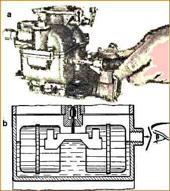 Қалқы камерасындағы отын деңгейі жоғарғы немесе төменгі белгіге дейін, яғни қалтқы камерасының бөлінген жазықтығынан 18-19 мм қашықтықта болуы керек.