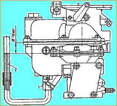 Екінші тексеру әдісі механикалық экономайзердің клапан арнасын жабатын тығынды бұрап алу және оның орнына шыны түтікпен 2 аяқталатын адаптер 1 (Cурет 7) бұрандасын бұрап алу болып табылады. қалқымалы камерадағы жанармай деңгейінің ауытқу шегін көрсететін онда белгіленген белгілер.