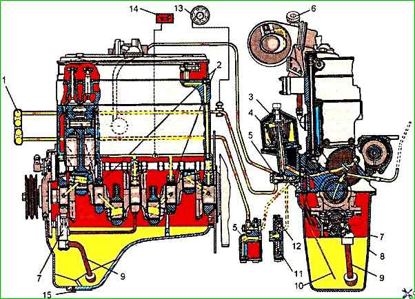 Бірінші негізгі подшипниктен май арнайы арналар арқылы аралық берілістің төлкелеріне және жанармай сорғысының жетек тетігіне, сондай-ақ жанармай сорғысына ағады.