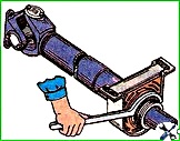 Көліктен жетек білігін алу үшін жетек білігінің артқы шанышқы-фланецін бекітетін гайкаларды бұрап алу керек, шайбаларды алып тастау және жетек білігіне қолдау көрсете отырып, фланец саңылауларынан болттарды алу керек.