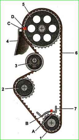 Надеваем новый ремень, прокладывая его ветви в соответствии с рисунком, и убеждаясь, что метка на зубчатом шкиве коленчатого вала расположена напротив прилива, выполненного на корпусе масляного насоса.