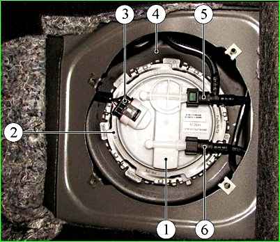 При установке топливного модуля в бак стрелка 1 на крышке топливного модуля должна быть направлена в сторону багажника.